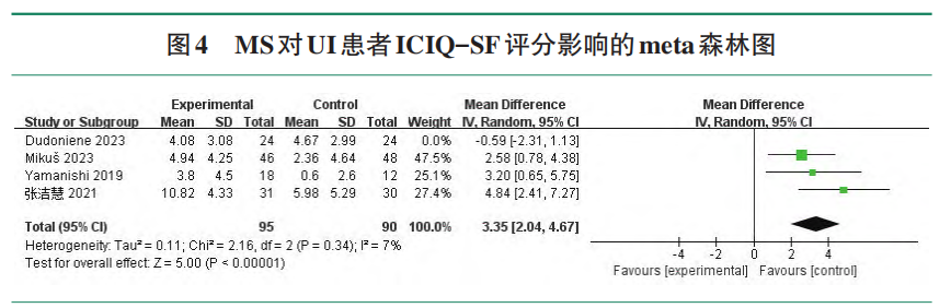 4.1 ICIQ-SF:共有4项研究使用了ICIQ-SF量表,共计233例患者。研究间异质性较大(I2=80%,P=0.04),故采用随机效应模型,通过逐篇敏感性分析发现异质性来源于Dudoiene的研究,剔除此项研究后异质性下降(I2=7%,P=0.34),这可能与该研究干预时间明显低于其他研究有关。结果显示,试验组ICIQ-SF评分的改善显著高于对照组,提示MS治疗可明显降低UI患者的ICIQ-SF评分(MD=3.34,95%CI:2.08-4.59,P<0.00001),有显著性差异。见图4。