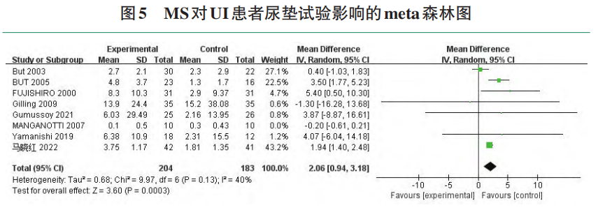 4.2 PWT:共有8项研究测定了尿垫重量克数,共计407例患者。由于研究间异质性较大(I2=87%,P<0.00001),故采用随机效应模型。敏感性分析发现剔除Man-ganotti研究后,异质性显著降低(I2=40%,P=0.13),这可能与Manganotti样本量过低,以及选用的刺激部位(S2-S4)有关。结果显示,试验组尿垫重量克数减少显著高于对照组,提示MS治疗可明显降低UI患者的尿垫重量克数(MD=2.06,95%CI:0.94-3.18,P=0.0003),有显著性差异。见图5。