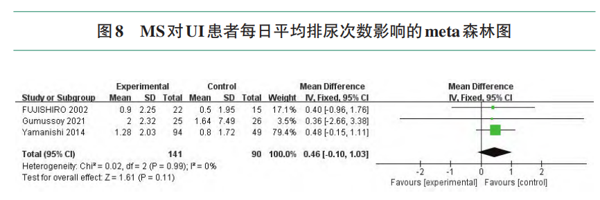 4.5 每日平均排尿次数:共有3项研究测定了每日平均排尿次数,共计231例患者,研究间异质性较小(I2=0%,P=0.99),故采用固定效应模型。结果显示,试验组每日平均排尿次数的减少明显高于对照组,提示MS治疗后,UI患者每日平均排尿次数明显减少(MD=0.46,95%CI:-0.10-1.03,P=0.11),但无显著性差异。见图8。