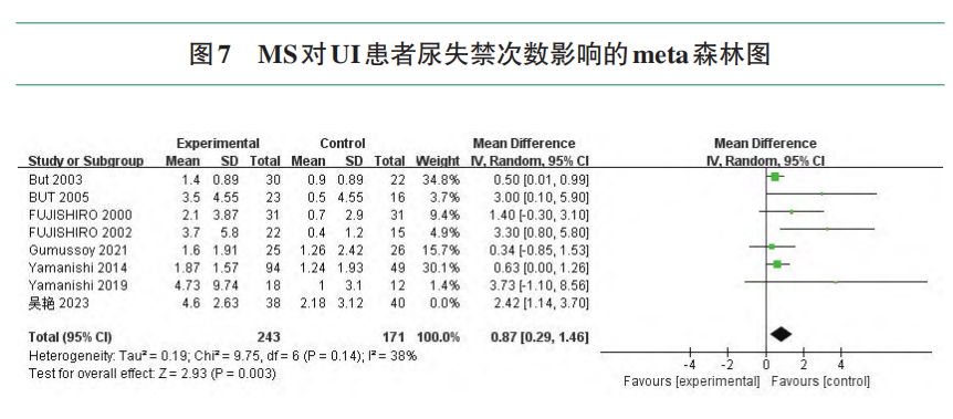4.4 尿失禁次数:共有8项研究测定了UI患者尿失禁次数,共计492例患者,由于研究间异质性较大(I2=57%,P=0.02),故采用随机效应模型。通过逐篇剔除文献的方法进行敏感性分析,发现剔除吴艳研究后,异质性显著降低(I2=38%,P=0.14),这可能与吴艳所采取的刺激强度过高(50Hz 100%MAX)有关。结果显示,试验组尿失禁次数减少显著高于对照组,提示MS治疗可明显降低UI患者的尿失禁次数(MD=0.87,95%CI:0.29-1.46,P=0.003),有显著性差异。见图7。