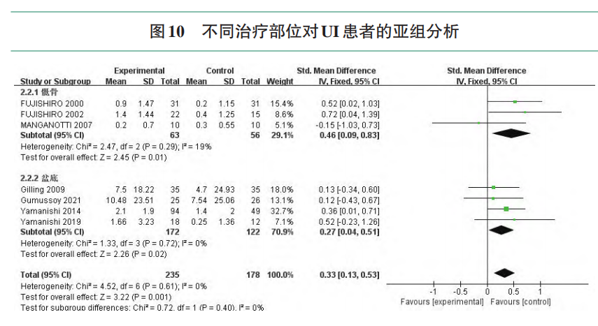 将I-QOL评分根据治疗时不同干预部位进行亚组分析,3篇文章对骶骨进行磁刺激,结果显示有显著性差异(SMD=0.46,95%CI=0.09-0.83,P=0.01)。4篇文章对盆底进行磁刺激,结果显示有显著性差异(SMD=0.27,95%CI=0.04-0.51,P=0.02),亚组分析显示,骶骨组和盆底组的I-QOL评分均高于对照组,但两者效果无显著性差异(P=0.40),见图10。