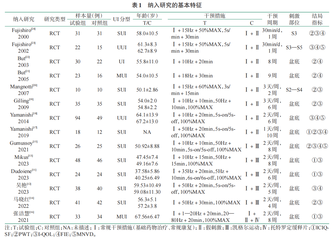 干预措施:试验组采用10Hz、10 50Hz、50Hz等不同频率及强度;对照组采用假刺激治疗或凯格尔运动。其余干预手段在两组间一致。