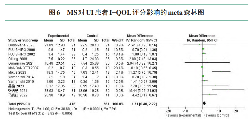 4.3 I-QOL:共有12项研究使用I-QOL量表,共计777例患者。由于研究间异质性较大(I2=72%,P<0.00001),通过逐篇剔除文献的方法进行敏感性分析,发现异质性结果均未发生明显改变,提示研究结果较为稳定,采用随机效应模型进行分析。结果显示,试验组I-QOL评分增高显著高于对照组,提示MS治疗可显著提高UI患者的I-QOL评分(MD=1.31,95%CI:0.40-2.22,P=0.005),有显著性差异。见图6。