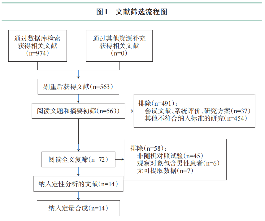 经检索得到相关文献974篇,剔除重复文献411篇,阅读标题和摘要后排除491篇,根据纳入和排除标准,阅读全文后排除58篇,最终纳入14篇文献,其中中文文献3篇,英文文献11篇。文献筛选流程及结果见图1。