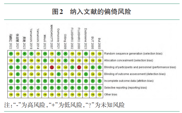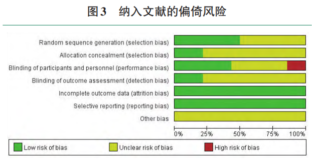 经过检索和筛选后纳入的14篇RCT文献,根据Cochrane偏倚风险评估量表对纳入研究进行评价。14篇文献中均提及“随机分配”,只有7篇文献详细描述了随机序列的产生过程。有3篇对分配隐藏进行详细描述,其余11篇均未描述。有6篇文献研究者或受试者施盲,有6篇对评估者施盲,有2篇未提及盲法。有3篇对研究结果进行盲法评价,有11篇未提及对研究结果进行盲法评价,纳入文献偏倚风险评价见图2-3。