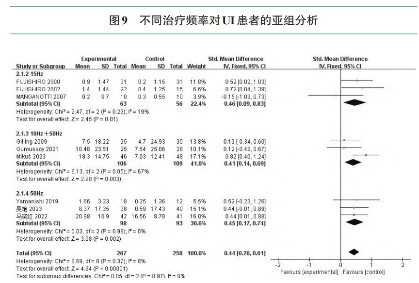 将I-QOL评分根据治疗时不同干预频率进行分析,3篇文章使用了15Hz进行干预,结果显示有显著性差异(SMD=0.46,95%CI=0.09-0.83,P=0.01)。3篇文章使用了10Hz 50Hz进行干预,结果显示有显著性差异(SMD=0.41,95%CI=0.14—0.69,P=0.003)。3篇文章使用了50Hz进行干预,结果显示有显著性差异(SMD=0.45,95%CI=0.17-0.74,P=0.002)。亚组分析显示,三组试验组I-QOL评分均高于对照组,但三者疗效无明显差异(P=0.97),见图9。